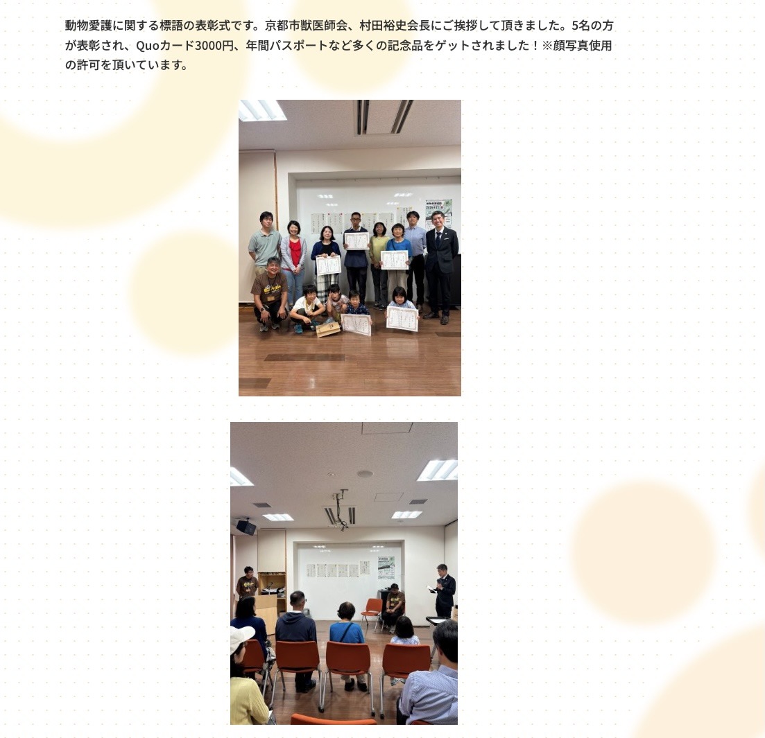オリジナルTシャツ、サーキットクイズ、動物慰霊祭、標語の表彰式も写真付きでバッチリと紹介していただいております。参加された京都市獣医師会の会員の皆様、関係者の皆様、本当にお疲れ差でした。
