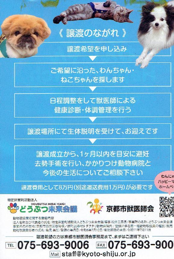 ぜひ、多くの方に利用していただき、不幸なわんちゃん、ねこちゃんの譲渡につなげたいと思っております。詳しくは京都市獣医師会もしくは京都中央動物病院の村田までお問合せください。